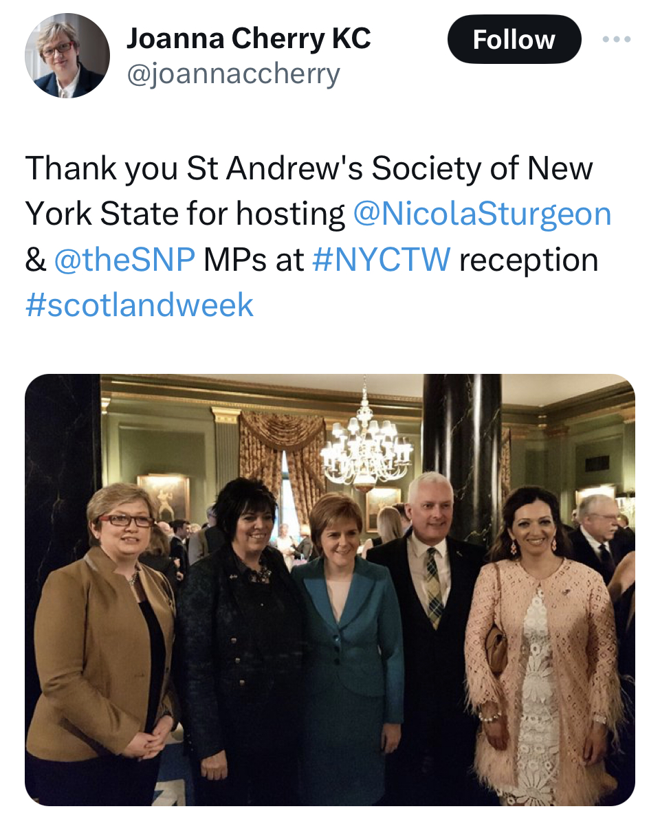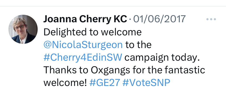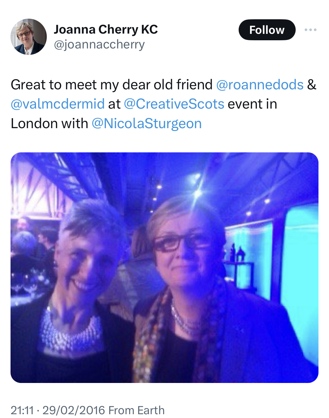 While she was in office, Cherry was the picture of loyalty. Her social media feed reads like a scrapbook of party unity: smiling beside Nicola Sturgeon at Creative Scotland events, celebrating government announcements, dutifully defending the SNP line. Only after losing her seat did she begin to discover her “independence of thought,” repackaging herself as the conscience of a party she never once publicly defied while it mattered.